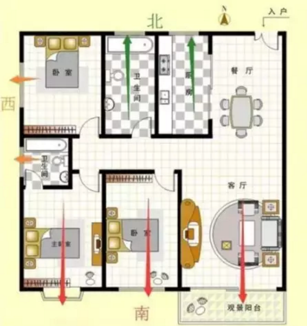 南北通透是指南北都有正對著的窗戶,能夠最大限度進(jìn)行空氣對流。一般業(yè)主購房的時候,都愿意去購買南北通透的房子,講究通風(fēng)性好、私密性好、符合風(fēng)水說法。一般指餐廳與客廳的窗戶或者廚房與客廳窗戶正對著,形成對流的這種情況,就可以稱之為南北通透。