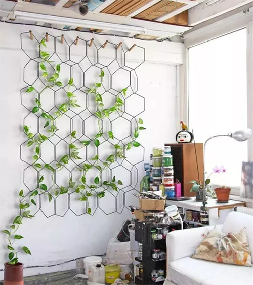 用金屬絲按規(guī)則或不規(guī)則的方式組合成一個整體,讓植物順著幾何架構(gòu)自然的延伸和生長,待它茂盛時你收獲的不僅是滿眼的綠色好風(fēng)景,更是清新怡人的好空氣。推薦植物:綠蘿。
