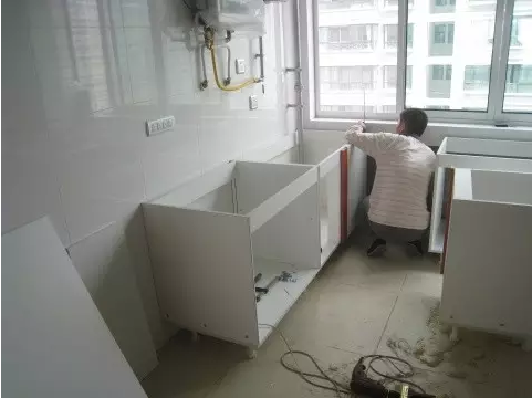 3、進(jìn)行櫥柜、油煙機(jī)等炊具的安裝,水槽(上下水件稍后安裝)和煤氣灶也要跟上,記得通知物業(yè)開通煤氣測試一下。