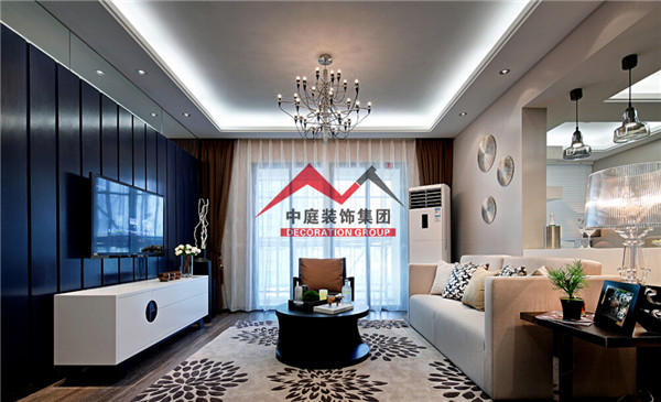 客廳主要運用灰調做主調,深藍色的電視背景墻凸顯出區(qū)域感,讓整個空間充滿神秘又不失格調的優(yōu)雅。