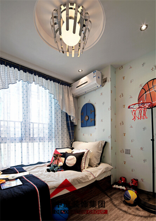為了增加小孩的臥室樂趣,采用墻紙裝飾整體。榻榻米式的床側面做了幾個抽屜,增加了儲物空間,正以放小朋友的玩具。