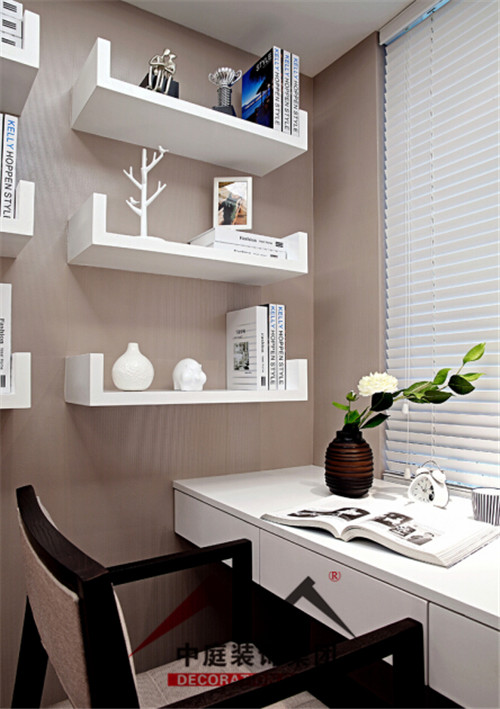 開放式的書房因為空間有限,設計師在墻面做了些架子,即起到了裝飾作用,也能用來放置書跟裝飾品,一舉兩得。