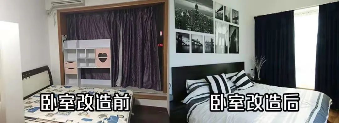 經(jīng)過改造后,擴大了臥室的空間,兩邊都有床頭柜,窗簾前置,設(shè)在飄窗里面,能夠完全遮擋住墻邊。地板換成淺木紋地板,奠定了輕松舒適的氛圍。