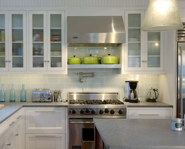 2、眾所周知,玻璃具有很強的透亮性,并且顯現(xiàn)效果也極佳,不會讓人覺得壓抑,所以在小房型的裝扮中,必然少不了玻璃材質(zhì)的運用,尤其是廚房吊柜中玻璃邊框的采用,非常具有現(xiàn)代感,另外在挑選櫥柜顏色時避免使用黑色、深棕色等較暗的色彩。