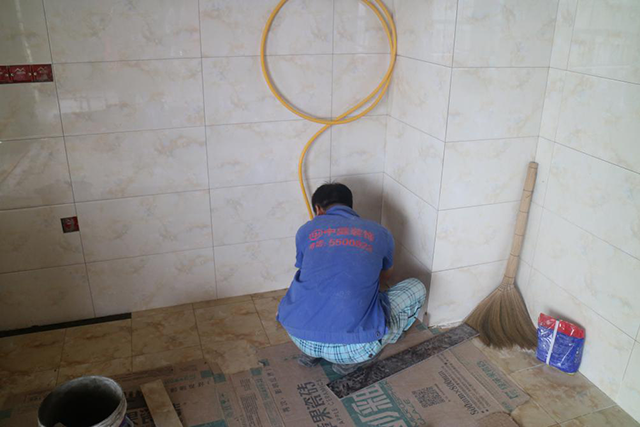 師傅正在忙著給廚房進(jìn)行鋪貼瓷磚,專業(yè)的鋪貼流程,做完一個(gè)區(qū)域馬上做地膜保護(hù),正在鋪貼的區(qū)域也用紙皮做臨時(shí)保護(hù),防止沙子刮花地面。