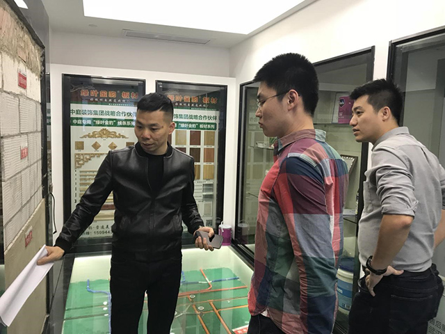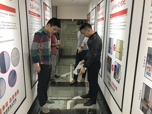 △【中航聯(lián)控股集團副總裁金洪路先生(右)向南寧慈銘代表團詳細介紹衛(wèi)生間施工工藝解剖】