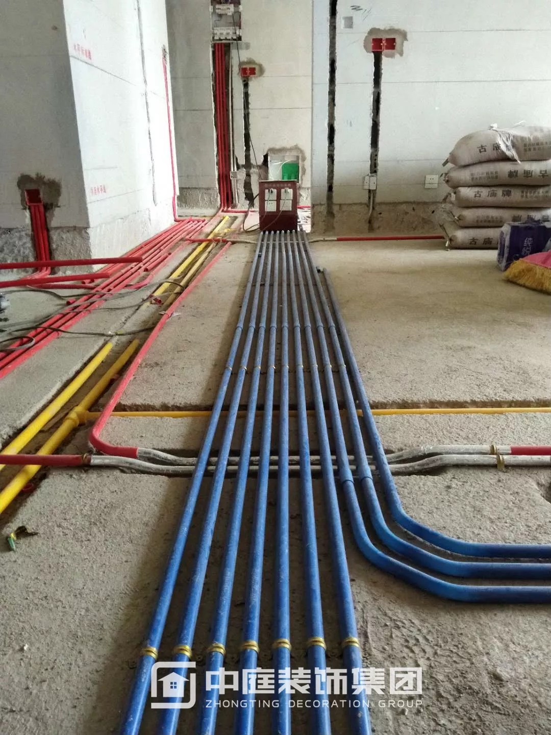 施工現(xiàn)場線管鋪設(shè)橫平豎直,按照集團(tuán)施工規(guī)定使用鐵皮卡扣固定,管和管之間留有足夠縫隙,以便鋪設(shè)地磚時水泥砂漿進(jìn)入管下,避免地磚后期出現(xiàn)空鼓;