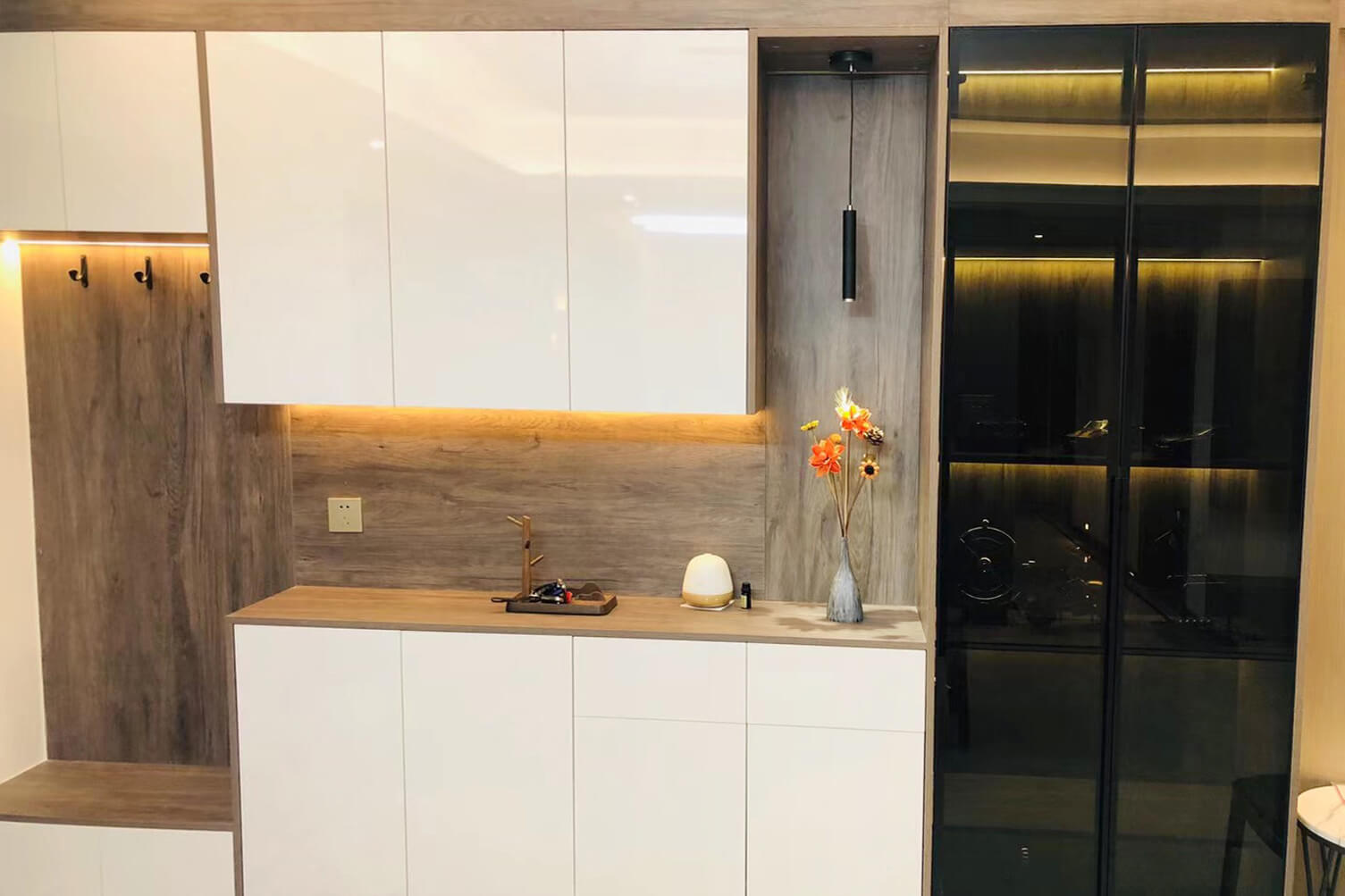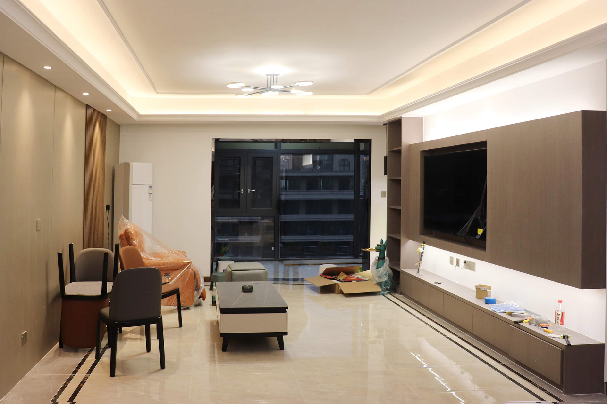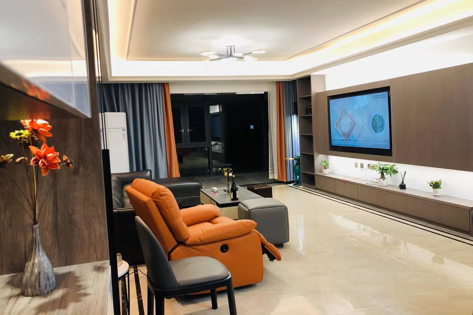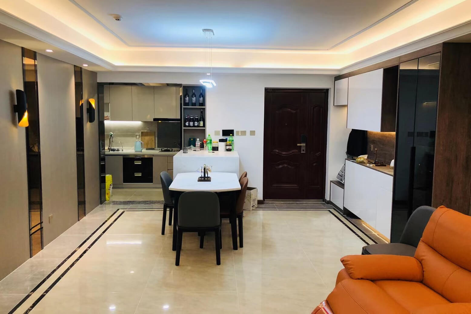 瀏覽量:344客餐廳選擇素色的木飾面顯現(xiàn)低調(diào)有內(nèi)涵,整個(gè)客廳及餐廳的吊頂直接一體貫穿,搭配著電視背景墻長(zhǎng)方體設(shè)計(jì)突顯空間的寬闊大氣,愛(ài)馬仕橙色的窗簾及單人沙發(fā)的呼應(yīng),增添了空間的活躍性;暖黃色燈光下白色的大理石吧臺(tái)及白色的高光柜門(mén)使得空間不再昏沉,局部黑色的鈦金夾著茶色的鏡面在大面積的素色木飾面的包裹下將現(xiàn)代的低調(diào)且奢華體現(xiàn)完美的體現(xiàn)了。