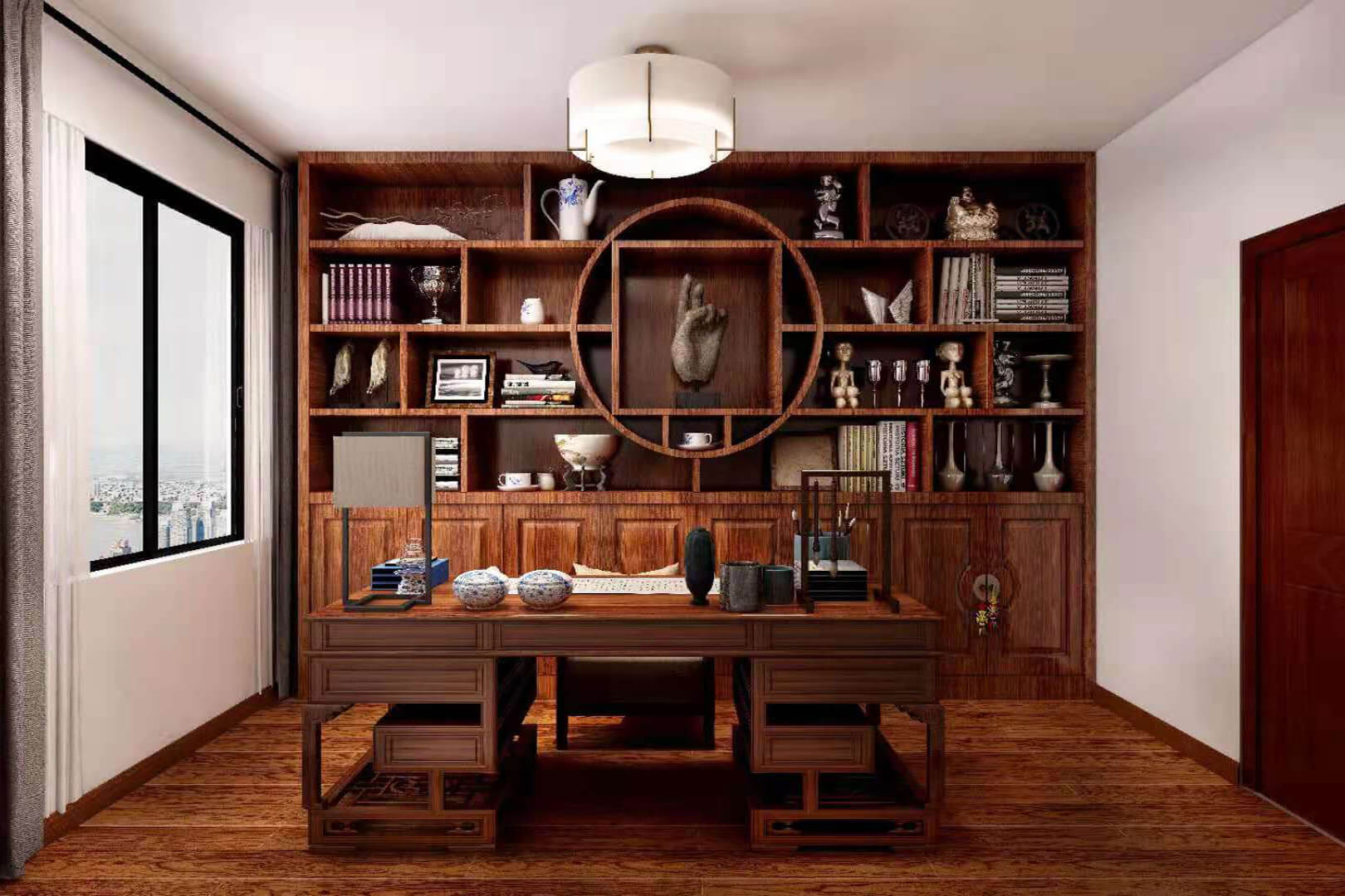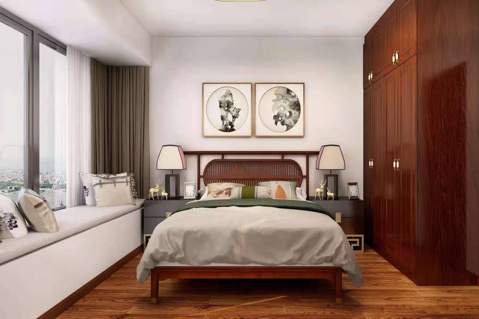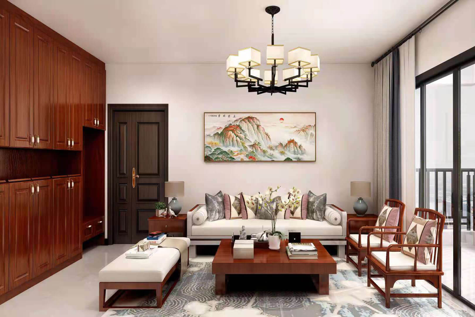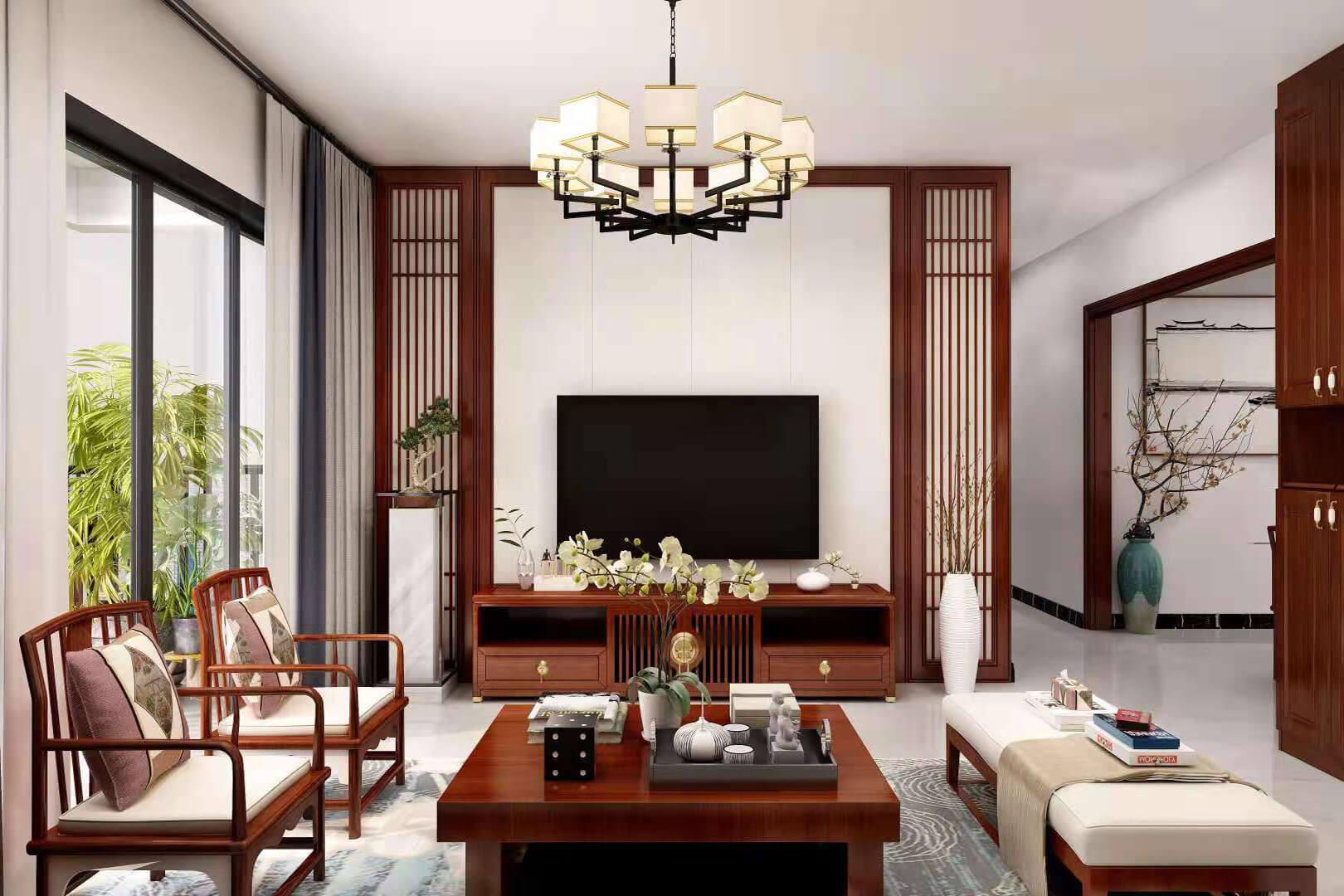 瀏覽量:555房子整體家具以紅木為主??蛷d采用白色地磚和留墻面與家具搭配讓顏色看起來更為簡潔,不做裝飾的吊頂讓整體的空間看起來更寬大。房間采用紅木地板與房間家具色彩呼應,墻面留白用水墨畫裝飾讓房間裝飾更豐富,也讓色彩更多了層次感。