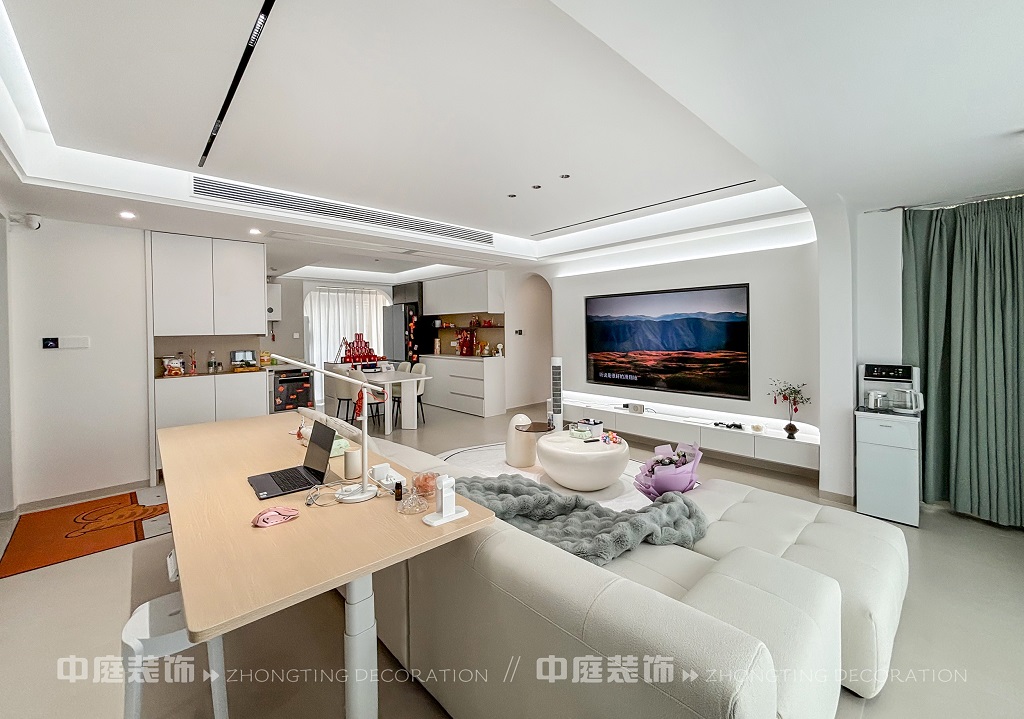 這套房子的裝修風格屬于現(xiàn)代奶油風格。整體以純凈的白色為主色調,營造出簡潔明亮的空間感。線條設計極為流暢,如拱形門洞、無主燈的線性燈帶,弱化了復雜裝飾,凸顯極簡美學。