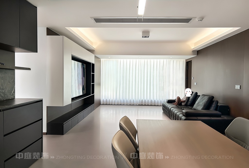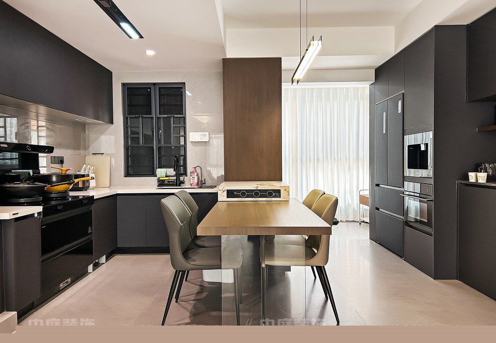 瀏覽量:55客廳以現(xiàn)代黑白灰極簡風格為核心,大面積白紗簾引入自然光線,黑色皮質(zhì)沙發(fā)質(zhì)感高級。開放式布局,深灰櫥柜與木質(zhì)餐桌形成材質(zhì)對比,線性吊燈提升精致感,功能與美學兼具,營造現(xiàn)代簡約的烹飪用餐氛圍。輕柔窗簾與柔和燈光,打造靜謐休息空間。精致的材質(zhì)選擇與合理的功能規(guī)劃,詮釋了“少即是多”的現(xiàn)代簡約居住美學。